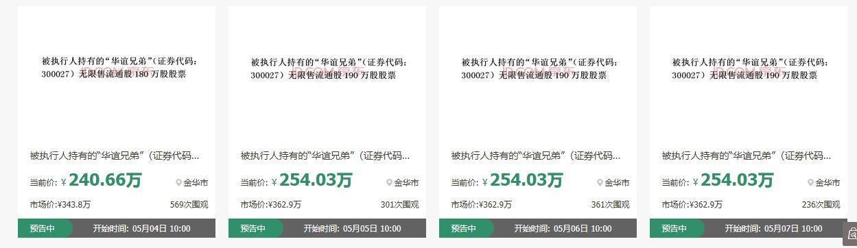 红星资本局在京东资产交易平台查询发现,目前,这些股票已在该平台上架,分为六个拍品,起拍价从241万元至254万元不等,拍卖时间分别为5月4日至5月9日的上午10时。