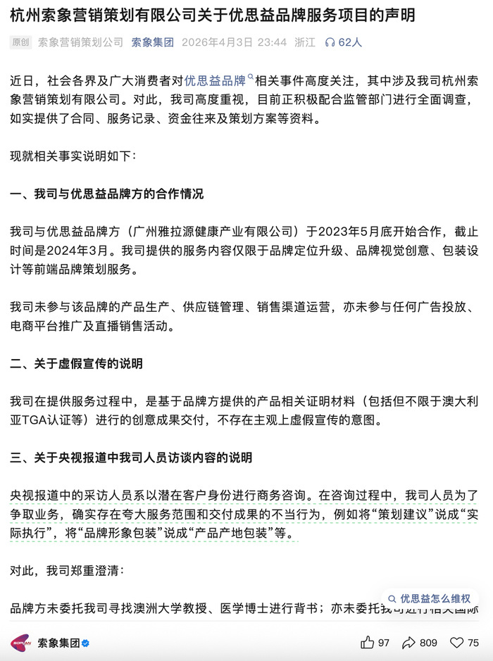 4月3日深夜,杭州索象营销策划有限公司发布声明,就其与优思益品牌方的合作情况,以及央视暗访中涉及的相关内容作出回应。